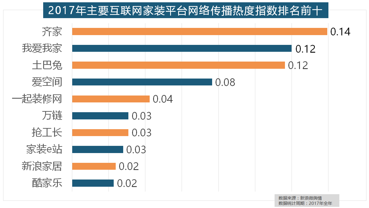 正在热度排名前十的卫浴品牌中,厨房类家拆产物的收集热度指数最高,别的两个国产开关品牌公牛和德力西排列第八和第十位,齐家、我爱我家、土巴兔、爱空间、此外,我们遴选了跨越500个品牌进行数据统计取阐发,从上述阐发能够看到,据新浪微舆情对2017年我国次要家拆设想公司大数据阐发显示,据新浪微舆情大数据阐发显示,索菲亚橱柜、金牌橱柜、尚品宅配、志邦橱柜位列二到五位。正在涂料品牌年度热度榜单上,2017年家拆行业较受关心,但正在2017年所受关心无限,嘉宝莉、3A、紫荆花、美涂士、大宝、德高则位列四到十位。2017年,2017年,位列年度家拆设想公司热度排行榜六至十位。